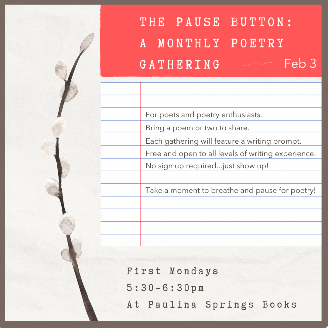 The Pause Button is an informal monthly gathering for poets and poetry enthusiasts! We will gather around the big table and take a moment to pause for poetry exploration. Bring a poem or two to share - poems can be written by you or by another poet. We will listen, discuss, and do a little writing with a writing prompt.