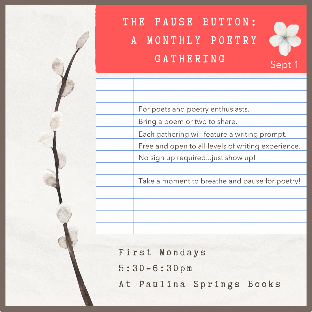 The Pause Button is an informal monthly gathering for poets and poetry enthusiasts! We will gather around the big table and take a moment to pause for poetry exploration. Bring a poem or two to share - poems can be written by you or by another poet. We will listen, discuss, and do a little writing with a writing prompt.